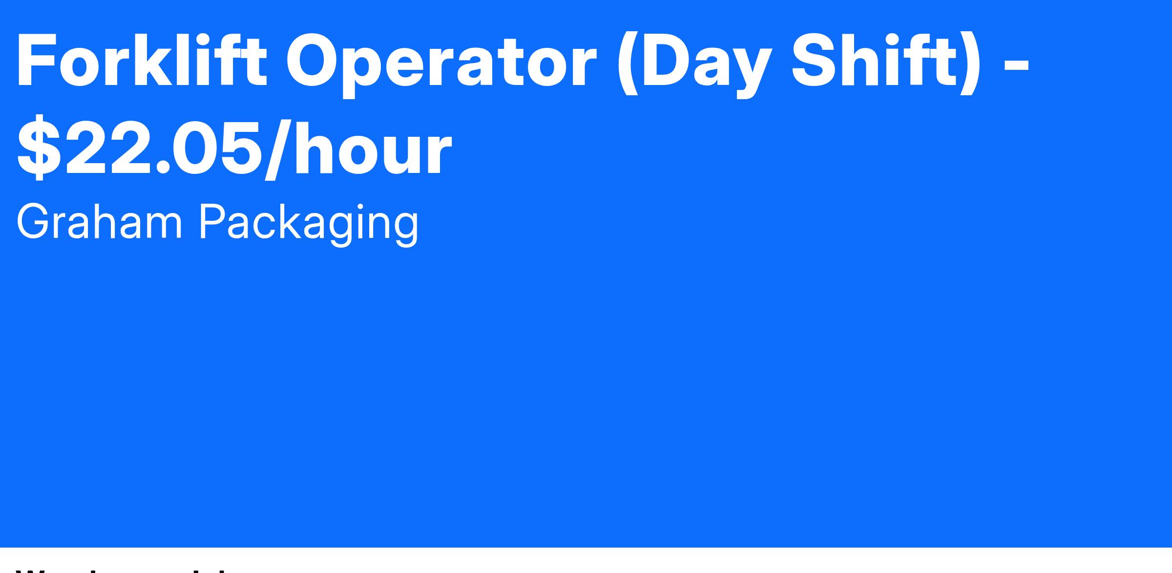 Graham Packaging Company is looking for a Forklift Operator based in Atlanta, Georgia. This opening is for DAY SHIFT, which operates during the hours of 7:00 AM to 7:00 PM on a 2/2/3 rotating schedule (working every other weekend).
