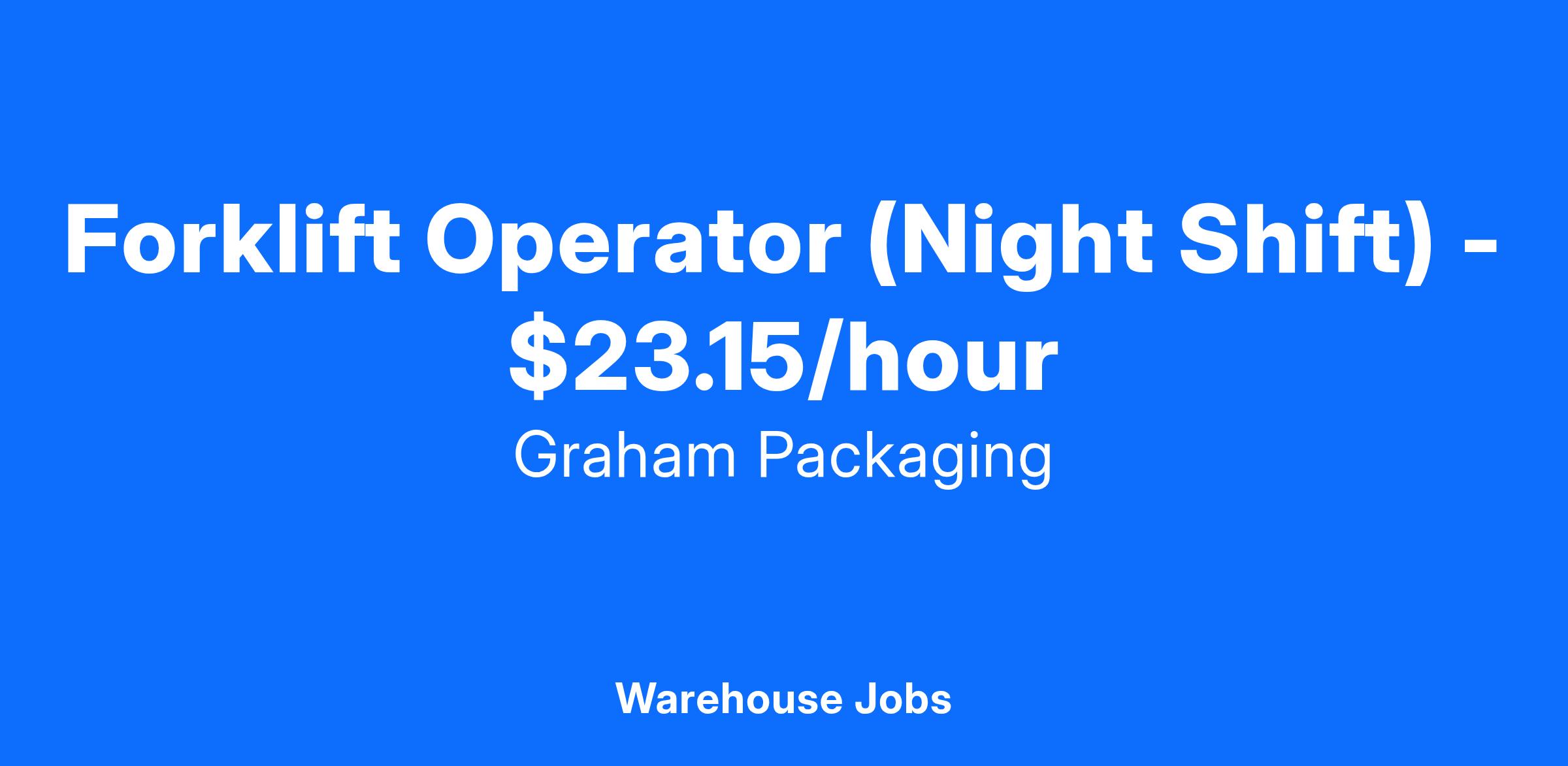 Graham Packaging Company is looking for a Forklift Operator based in Houston, Texas. Night Shift schedule 6:00 pm- 6:30 am, 4 days one week and 3 days the next.