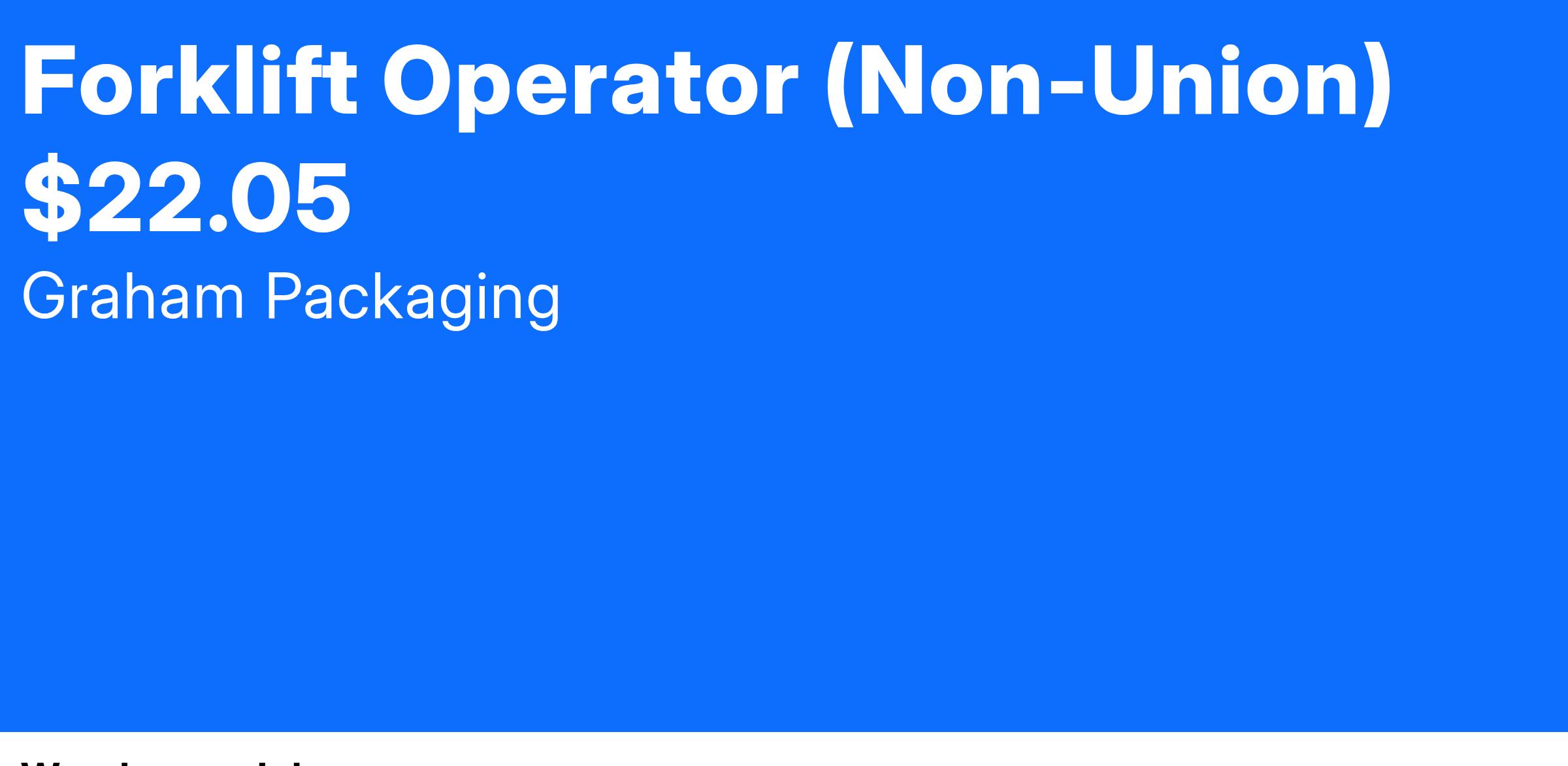 Graham Packaging Company is looking for a Part Time Forklift Operator based in Atlanta, GA on day shift 20 hours per week.